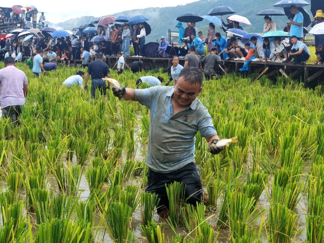 最热闹的当属龙江乡。作为“2025中国美丽乡村休闲旅游行”精品线路核心区,这里的稻田与茶园成了游客的“欢乐场”。稻田公园内,稻浪翻滚,稻花鱼诱人,游客们挽着裤脚下田捉鱼,此起彼伏的笑声,成了田间最鲜活的风景。“今天雨不大,看他们捉鱼很有意思,我们也要试试。”游客岳子豪、呼子彦挤在围观人群中,满是心动:“到时候把自己亲手捉的鱼带去农家乐加工,从‘田间’到‘舌尖’,那真是新鲜。”
