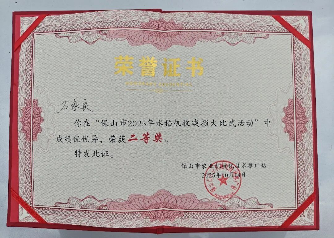 10月14日,保山市2025年水稻机收减损大比武活动在腾冲市滇滩镇胜利社区稻田拉开帷幕,全市5个县(市区)共10位选手参加比赛,由龙陵县推荐的勐糯镇大寨村选手石家良凭借熟练、精湛的操作技能和高超的机收减损能力,荣获“保山市2025年水稻机收减损大比武活动”二等奖。