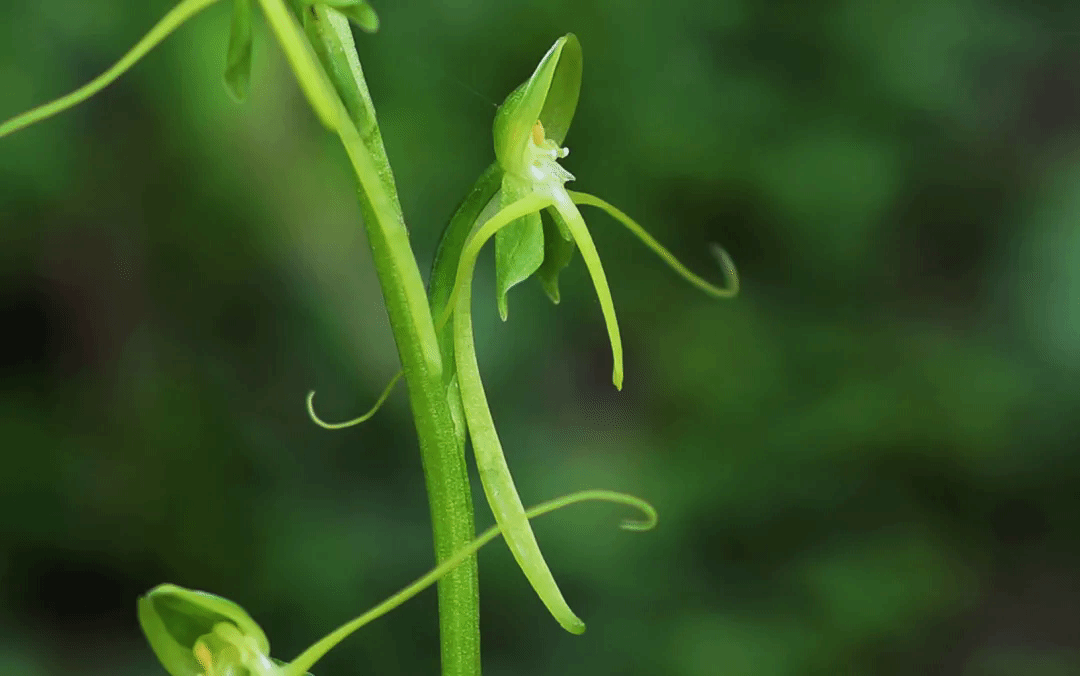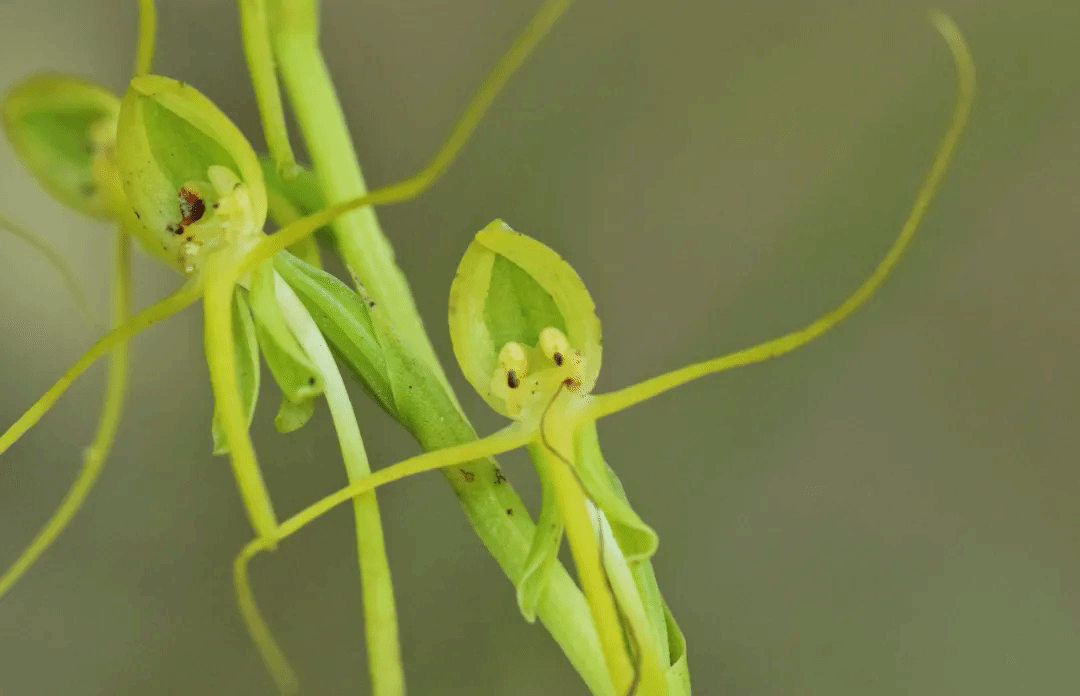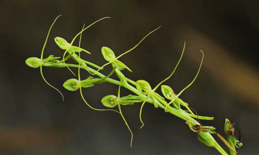 莲座玉凤是一种独特而迷人的植物。一株株亭亭玉立的花杆上,着生有形似钻头的花苞、形如纺锤形的果实,形成“花果同框”微生态景观。尤其是花朵的结构格外奇特,上部的外层花瓣微微上翘,如镰似舌。圆柱型的子房成大写字母“J”字状,两边扭曲的丝状侧裂片十分酷似“龙须”,两侧裂片与中裂片呈90度角张开,整体展现出长线条与空间感的自然结合。