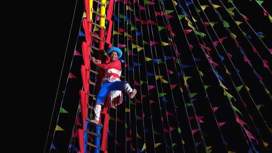 20时20分,“上刀杆”表演如约而至。在震天的锣鼓声中,四名傈僳族非物质文化遗产代表性项目传承人赤脚踩上锋利的钢刀,一步步攀上数米高的刀杆,动作矫健而沉稳。刀刃在灯光下闪着寒光,他们却如履平地,时而做出倒挂金钩、凌空旋转的高难度动作,惊险刺激的动作表演引得台下观众阵阵惊呼,掌声、喝彩声此起彼伏。