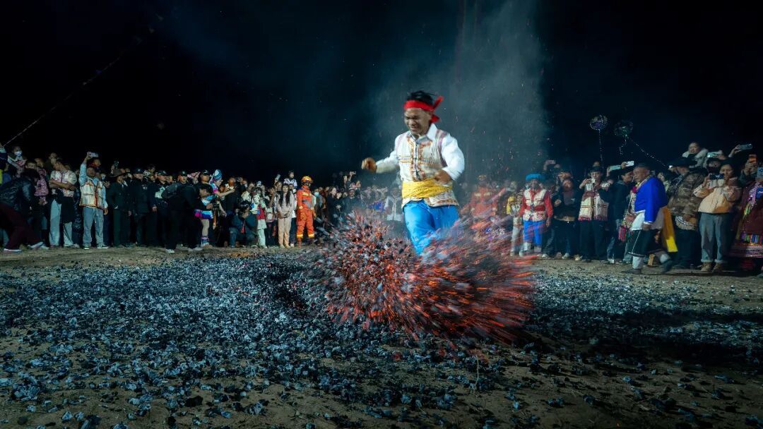 在“下火海”中,四名傈僳族勇士高挽裤腿。赤脚在通红的炭火铺成“火海”上来回跳跃,火星四溅惊险刺激,精湛的技艺让观众叹为观止。勇士们赤脚踏刃、徒手涉火的绝技,不仅展现了傈僳族坚韧豪迈的民族品格,也传递着祈福纳祥的美好愿景。