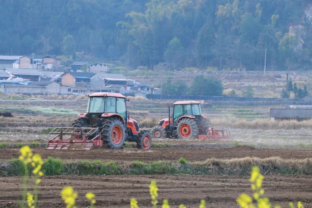 在烤烟种植户杨荣凯的百余亩烟田里,机械化协同作业有序开展。大型拖拉机牵引旋耕机进行深翻,小型理墒机同步整理垄沟,多机联合作业,有效提高了备耕效率。