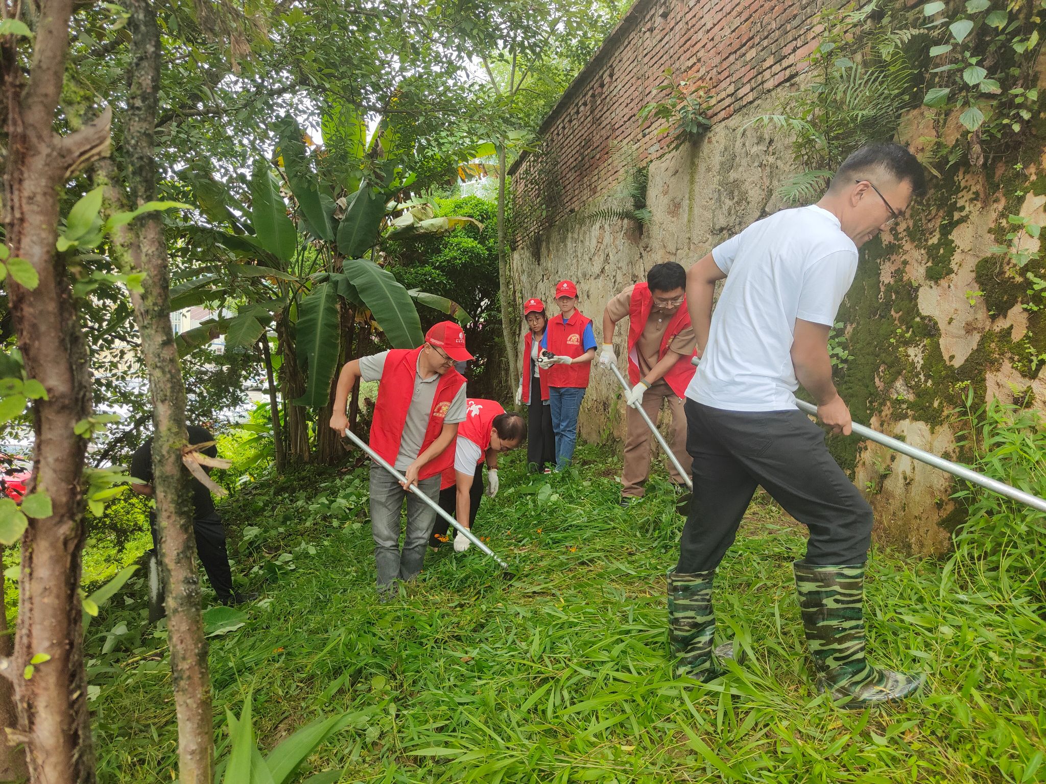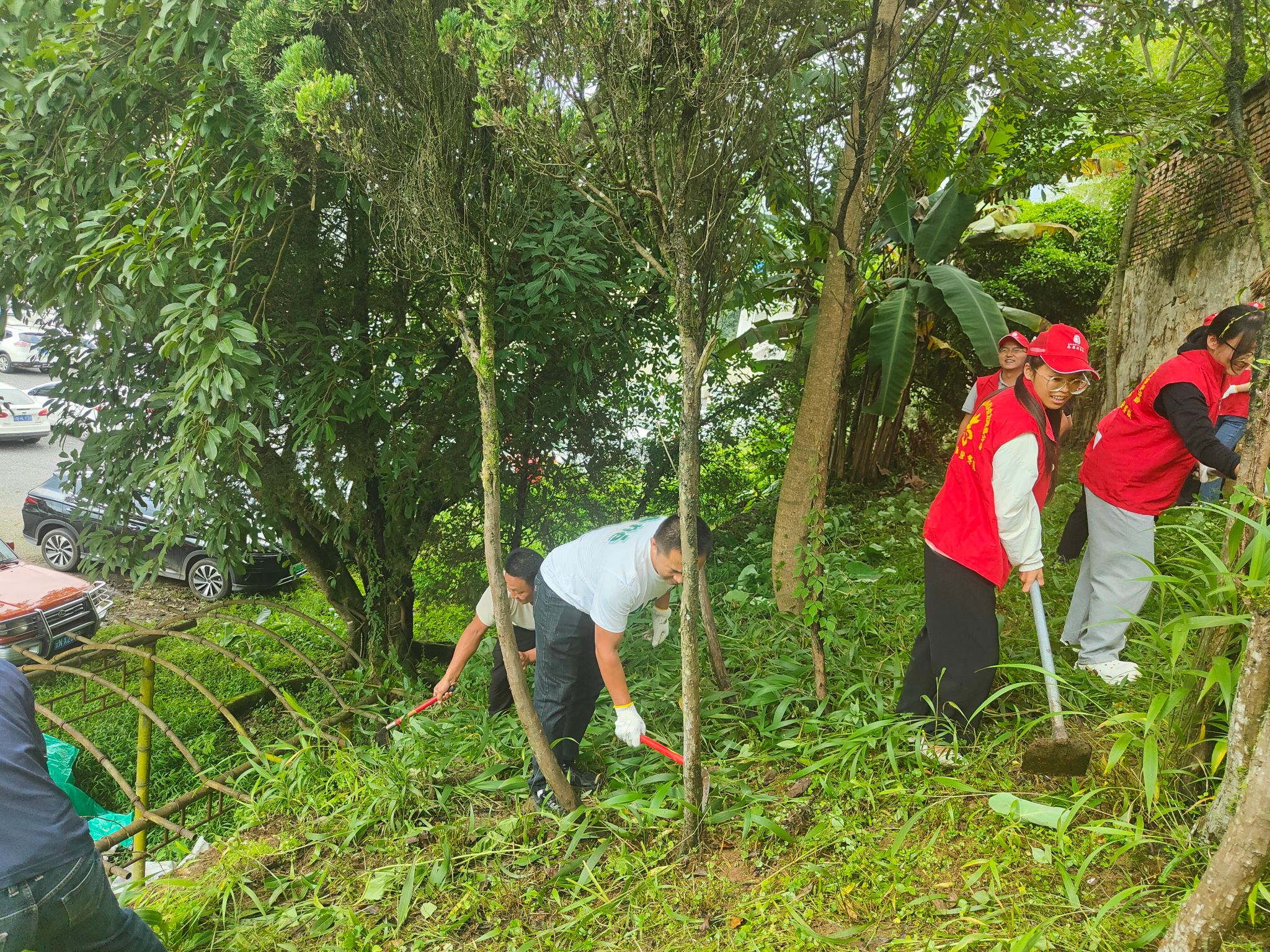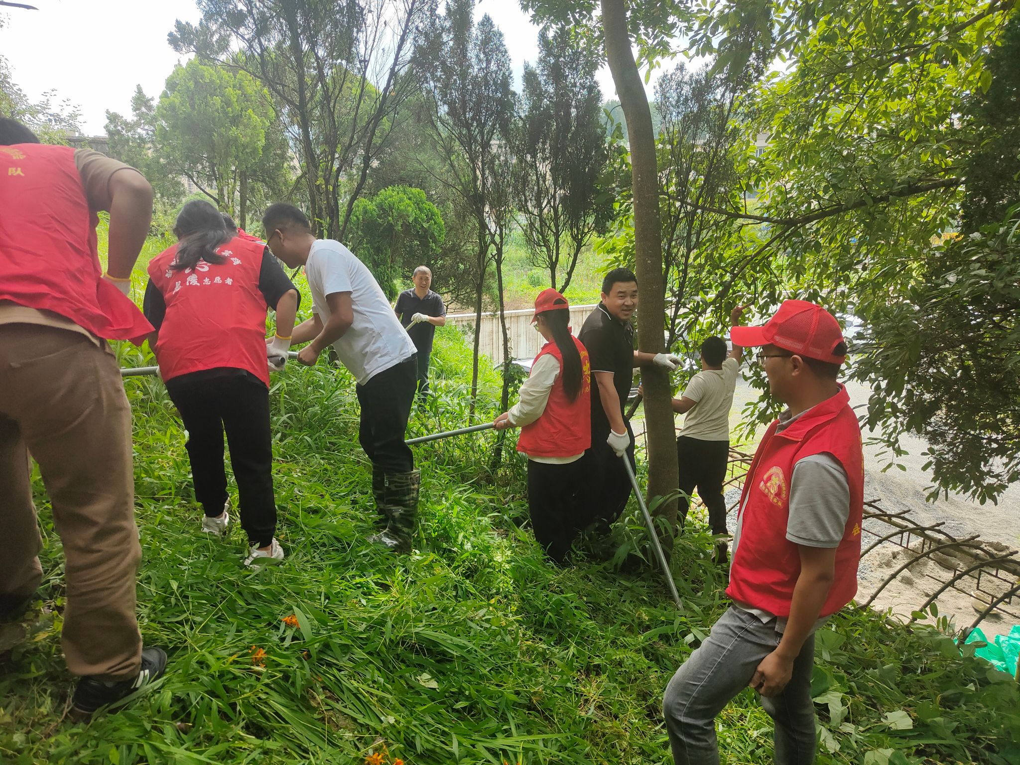 志愿者们冒着烈日,在单位后院认真用镰刀和锄头等工具清除杂草,尤其是女同志不怕苦不怕晒,除草的劲头丝毫不比男同志差。经过一个多小时的努力,后院的杂草被清除大半,绿色美丽的院子又重现在大家眼前。