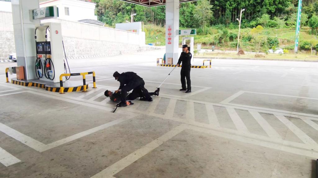 会后,所有参会人员到东坡加油站集中开展反恐防暴应急演练。反恐办民警现场向加油站工作人员讲解了防暴棍、盾牌、腰叉、脚叉等警械的使用方法,并模拟情景进行现场演练。演练场景逼真、处置人员动作到位,有效提高了加油站工作人员处置警情的意识和能力。