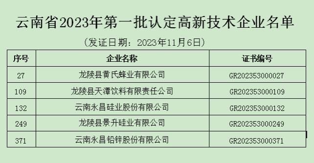 近日,云南省科学技术厅 云南省财政厅 国家税务总局云南省税务局公布了云南省2023年第一批高新技术企业及更名高新技术企业名单,我县5家企业顺利通过云南省2023年第一批高新技术企业认定。其中,云南永昌铅锌股份有限公司、云南永昌硅业股份有限公司、龙陵县黄氏蜂业有限公司、龙陵县天潭饮料有限责任公司4家企业为复审认定;龙陵县景升硅业有限公司为新增认定。