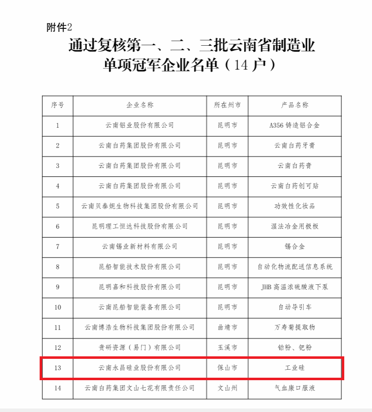 近日,云南永昌硅业股份有限公司凭借其卓越的创新能力和市场竞争力,自2018年后再次荣获省级制造业单项冠军企业的荣誉,成为保山市目前唯一一家省级制造业单项冠军企业。