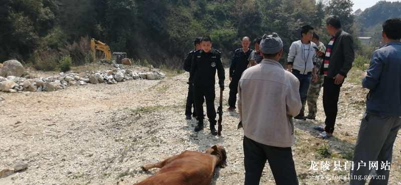 3月29日中午,熊某鑫持电话向镇安派出所报称:“我们大坝向阳寨有一家的黄牛跑出来,见到人就攻击人,现在牛沿着公路跑到了黄草坝,请处理。”接报后,镇安派出所民警立即赶往现场处置,向报警人熊某鑫了解得知:3月29日12时许,大坝村向阳寨熊某生家中的黄牛从圈中跑出后,开始攻击熊某生,致熊某生腰部受伤,之后,牛又沿320国道离开,熊某鑫与村民跟随牛来到龙新乡黄草坝一修理厂后面的空地上。因牛具有攻击性,经熊某鑫与熊某生联系,熊某生同意将牛打死。14时05分,接镇安派出所支援通知,巡特警大队副大队长带领警力迅速前往处置,在国道320线海螺水泥厂附近将其击毙,及时消除了安全隐患。