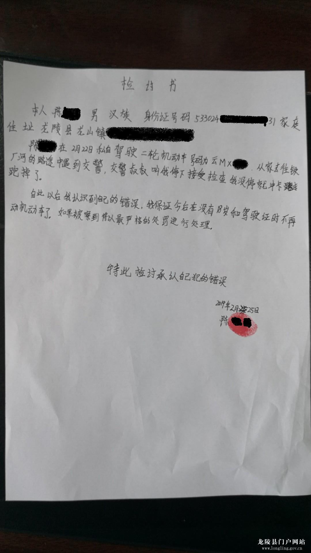 通过核实闯卡驾驶员未满十四周岁,龙陵交警大队责令其父亲加以管教,其父亲随即要求其儿子向龙陵交警大队写了检讨书并保证以后绝不无证驾驶。