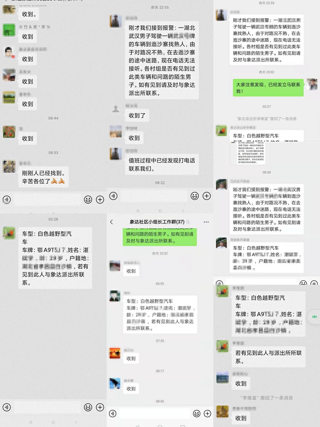 接警后,象达派出所迅速组织警力,兵分几路展开救援工作。一组民警负责查找湛某踪迹,民警通过查看大关梁子执勤卡点登记本和视频监控,确定了湛某进入象达镇的时间,最终确定湛某在象达镇迤沙寨附近走失。此时另一组民警已经马不停蹄地赶往迤沙寨村委会,并通过微信群广泛动员邻近村社开展摸排,联合广大群众的力量,进一步搜寻湛某踪迹。