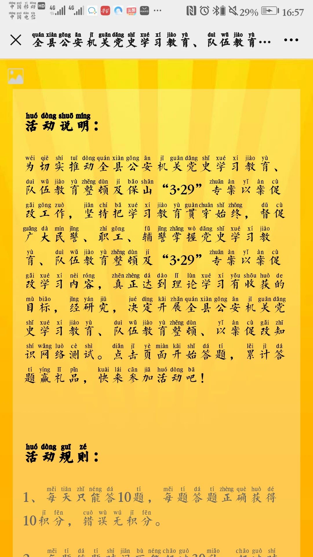 为深入学习习近平新时代中国特色社会主义思想,引导广大民警、职工、辅警进一步增强“四个意识”、坚定“四个自信”、做到“两个维护”,增强政治意识和政治能力。近日,龙陵县公安局在疫情防控、打击跨境违法犯罪等工作任务十分繁重的情况下,坚决克服工学矛盾,结合党史学习教育、队伍教育整顿及保山“3·29”专案以案促改工作,在“龙陵警方”微信公众号推出为期一个月的网络知识测试,实实在在以“考”促学。