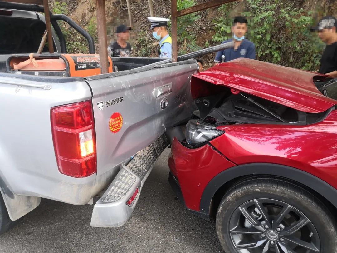 近日,龙陵交警大队处理了一起“奇怪”的事故。有群众报警称,发生两车相撞事故,请处置。交警大队事故处理民警到达事故现场后,看到一辆红色越野车和一辆银白色皮卡车相撞,红色越野车的车头已经严重受损,皮卡车尾部也受损变形。民警根据现场情况初步判断是一起追尾事故,但经过详细了解,事故远远没有那么简单。