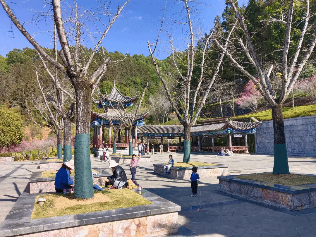 东坡森林公园则另有一番景致。蓝天白云下,草木青翠,蜿蜒步道串联起亭台楼阁,中式飞檐与葱茏山色相映成趣。溪畔石边,游人围坐野餐;广场上,初绽的梅花与常青林木交织出层次丰富的画面,吸引游客驻足拍照。