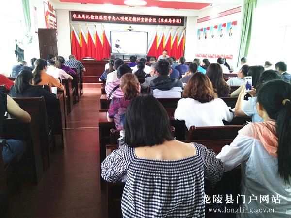 为进一步严格贯彻落实中央八项规定精神,营造良好氛围,8月27日,龙陵县农业局纪检组组织召开了落实中央八项规定精神宣讲会,会议由农业局副局长王宗朝主持,纪检组长郑贵泽主讲,农业局机关全体人员,各二级单位正副职领导、财务人员,核算中心全体人员共58人参加了会议。