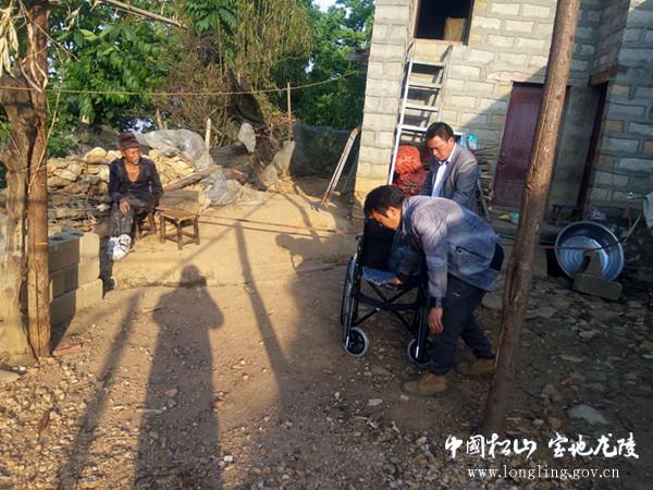 龙陵县农业局职工黄家朝于4月23日到碧寨乡三家村搾地下组赵广华户家开展挂包帮回访工作,当他了解到赵光华的父亲赵胜成在14年前因跌倒,造成腰椎受损,下肢瘫痪,丧失劳力,只能用手依靠两个小板凳交替挪腾行动,目前下肢已逐渐失去知觉,行动极为不便,生活难以自理这一情况后,黄家朝同志及时与龙陵县残联沟通协调,帮助赵胜成解决一台轮椅,并于2018年4月25日将轮椅送到赵胜成手中,解决其行动不便及生活自理问题。