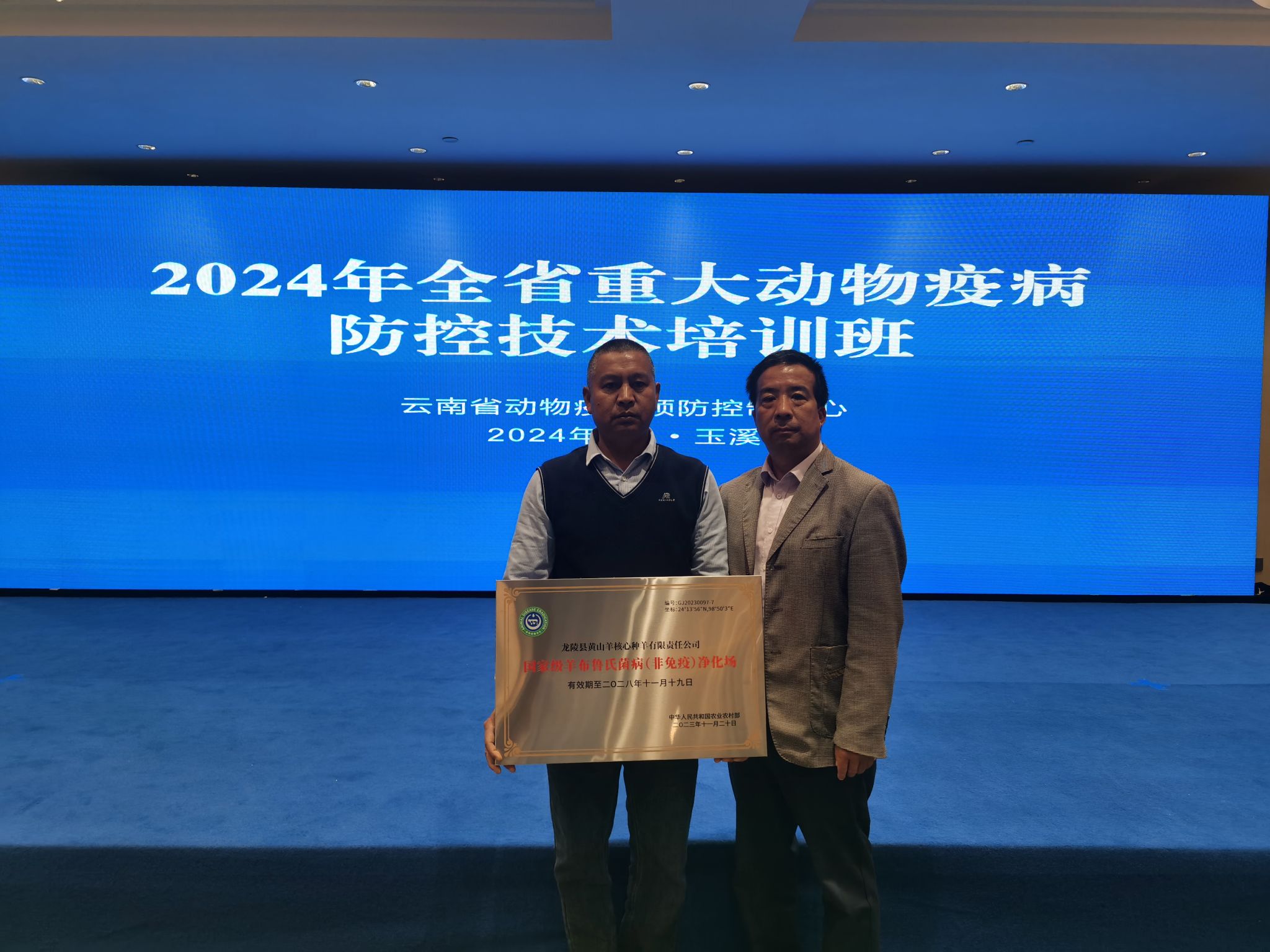 近日,在全省重大动物疫病防控技术培训会上,龙陵县黄山羊核心种羊有限责任公司被授予“国家级羊布鲁氏菌病(非免疫)净化场”,成为全省被农业农村部评审通过的唯一种羊场和全省草食畜企业中的首个国家级疫病净化场。