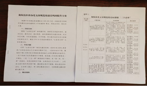 制订方案,明确任务。及时制定《龙陵县扶贫办党支部规范化建设巩固提升方案》明确目标任务及时间要求,并针对存在问题,切实采取措施,补齐短板,努力提升扶贫办党支部建设标准化水平。
