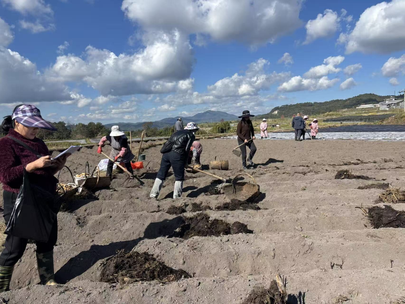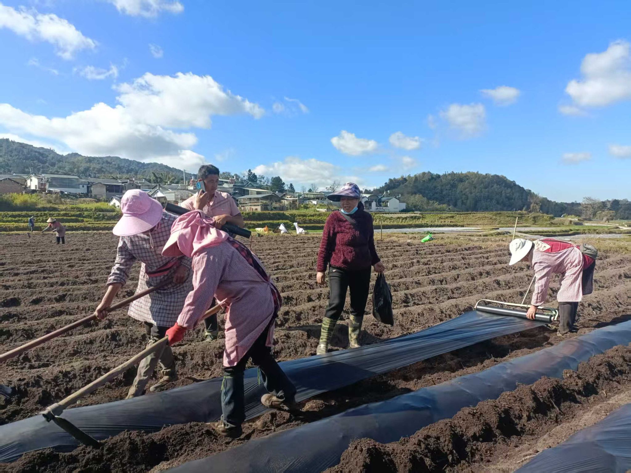 在坪子组的承包地里,农妇们早已头戴草帽、身着围裙、手持锄头,在田间奏响了忙碌的农事乐章;县级农技人员也扛起锄头下田,有的整肥、有的播种、有的覆膜、有的记录,各司其职,忙得热火朝天。田间地头,一派生机勃勃的繁忙景象。