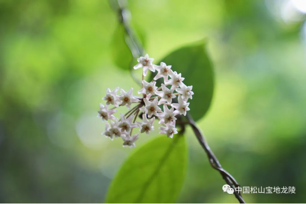 “飞藤引蔓缀粉球,独特花冠颜如玉,娇容体态似五星,风来难隐谷中香……”