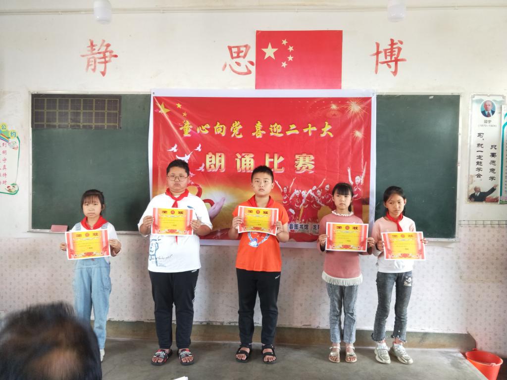 此次活动共配送流动图书800余册,与邦焕小学联办“童心向党 喜迎二十大”朗诵比赛,活动在6月初开始筹备,每班推荐2名同学参赛,共有12名小朋友参加决赛。“小鸟爱蓝天,鱼儿爱大海,小草爱大地,花儿爱阳光,我们小朋友从小爱祖国......”小朋友稚嫩清脆的声音表达着对祖国的热爱、对党的赞颂。