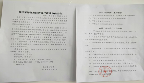 根据《中华人民共和国审计法》第二十五条和《党政主要领导干部和国有企事业单位主要领导人员经济责任审计规定》的规定,受县委组织部委托《关于对闫义智进行任中经济责任审计的委托书》(审计委托〔2019〕4号),经中共龙陵县委审计委员会批准,龙陵县审计局派出审计组,自2019年7月22日起,对龙陵县卫生健康局局长闫义智同志2016年1月至2018年12月任职期间经济责任履行情况进行审计,审计组于7月17日到县卫生健康局召开了审计进点会。