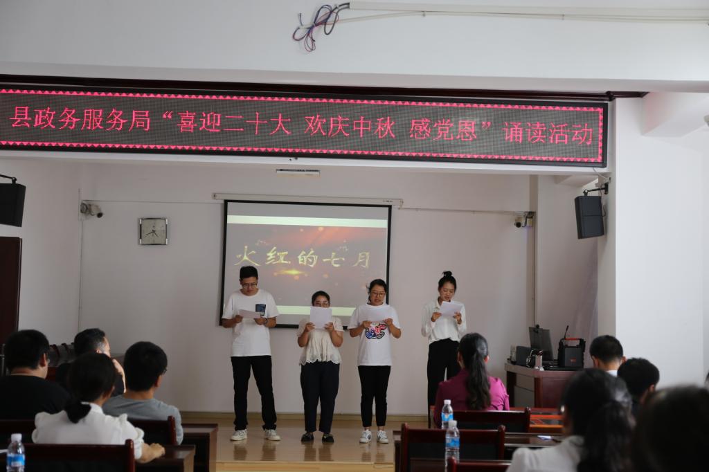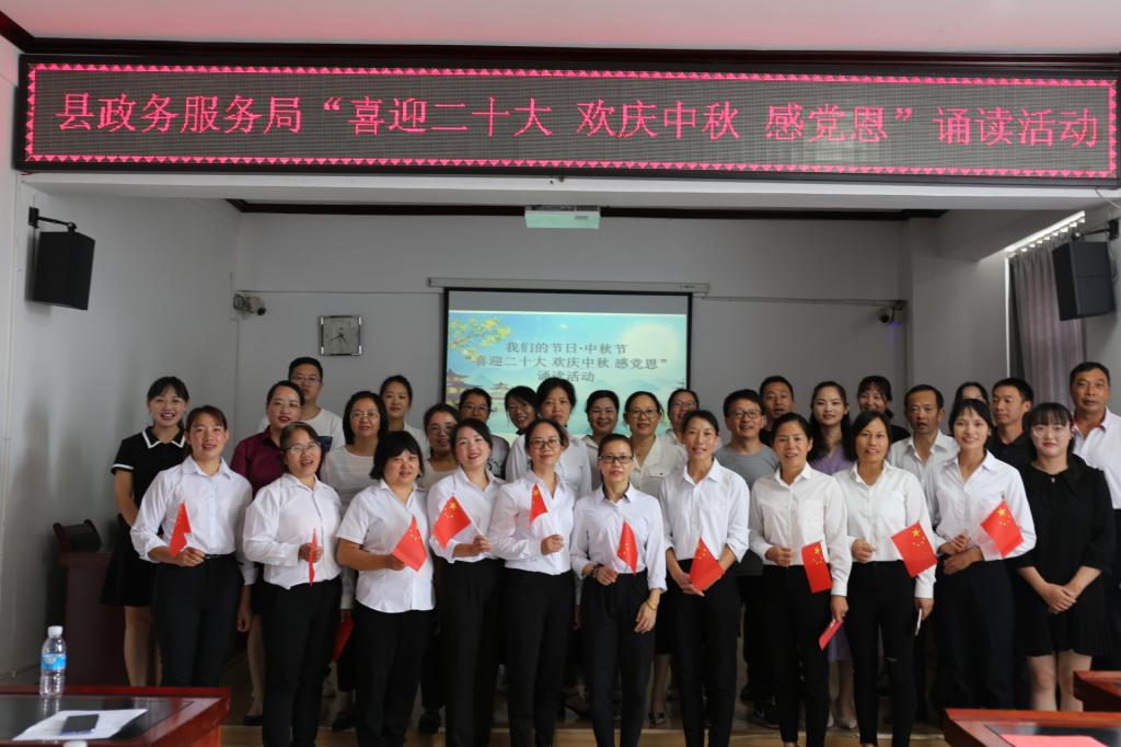 金秋送爽,硕果飘香。又是一年秋风送爽时,又是一个花好月圆日。为弘扬中华民族优秀的传统文化,营造文明祥和、团圆和谐的节日氛围,9月9日,县政务服务局举办“喜迎二十大 欢庆中秋 感党恩”诵读活动。