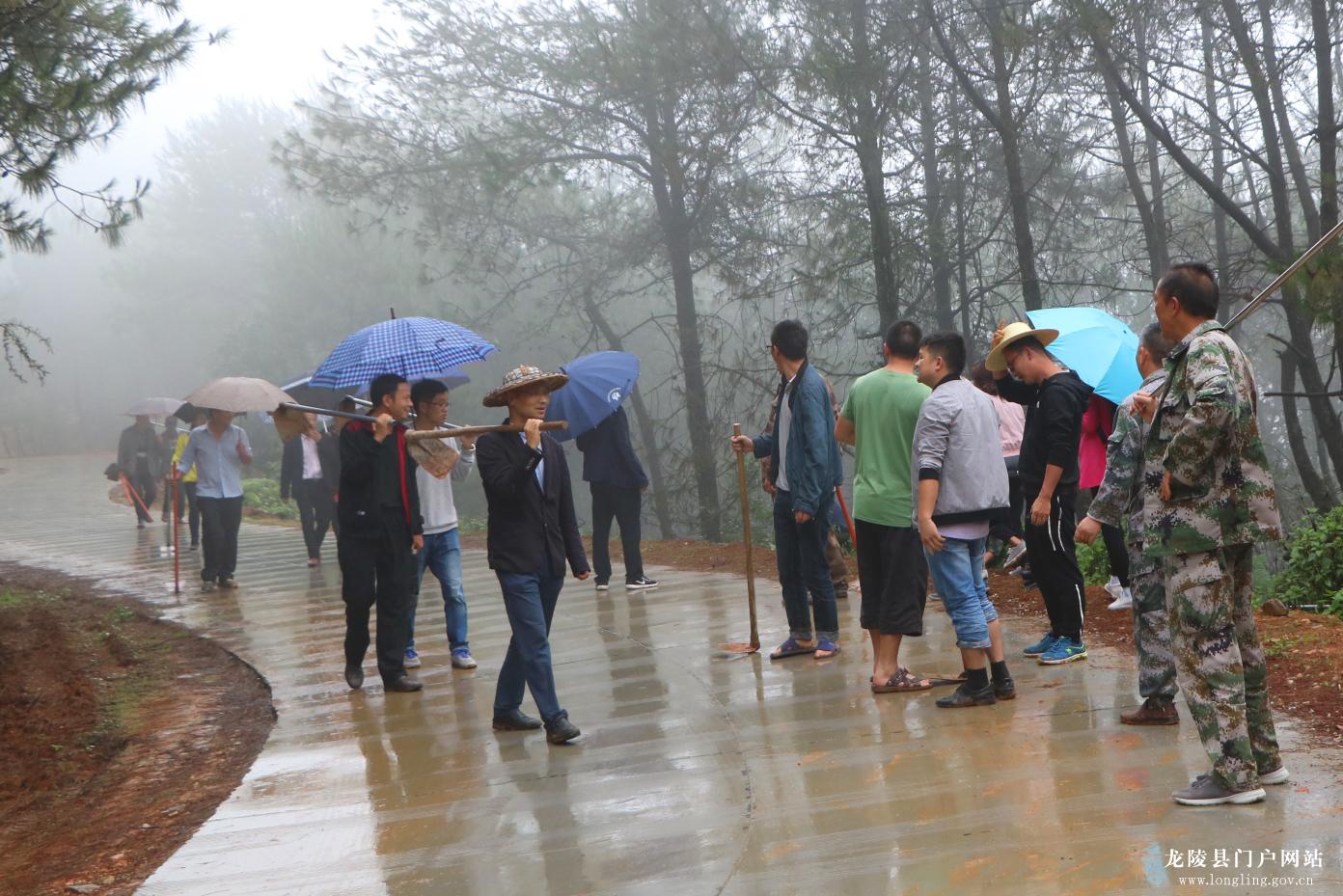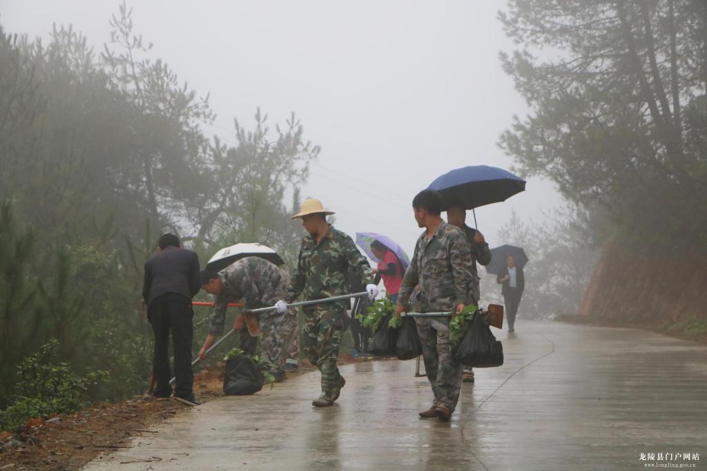 在植树现场,大家冒雨前行,热情丝毫不减,干劲十足,挥锹铲土、扶苗栽植,相互配合着将一棵棵树苗栽入土中,忙得不亦乐乎。因正值雨季,一个多月的雨已把泥土浸透,树苗较易成活。活动持续开展四个多小时,5000多株树苗“安家落户”,为6.3公里的道路增添了一道靓丽的风景线。