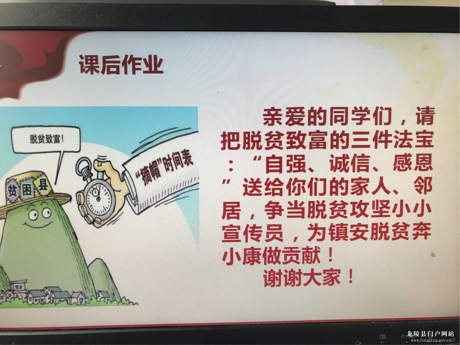 授课老师从心怀感恩,幸福生活从哪里来;自立自强,脱贫致富奔小康;诚实守信,信誉比金钱更重要三个方面做了全方位的讲解,更好地引导了孩子们正确认识贫困户,教育孩子们,学会感恩、诚实守信、自强不息。同时通过小手拉大手的形式使“扶贫先扶智、扶贫先扶志”等观念向孩子们延伸!倡议全镇小学生要争当脱贫攻坚的讲解员、解说员,为家庭的脱贫奔小康出谋划策,引导家长感恩党的好政策。不等,不靠,不要,依靠自身,努力实现脱贫致富,让孩子们明白“争贫可耻,脱贫光荣”的思想。