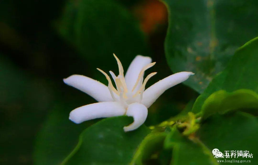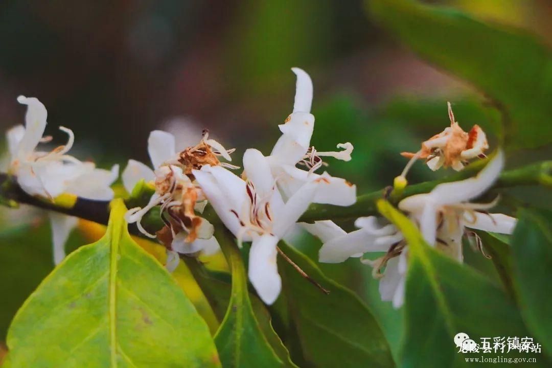 油亮墨绿的枝叶间,悬挂着未谢的咖啡花絮,花朵洁白如玉。