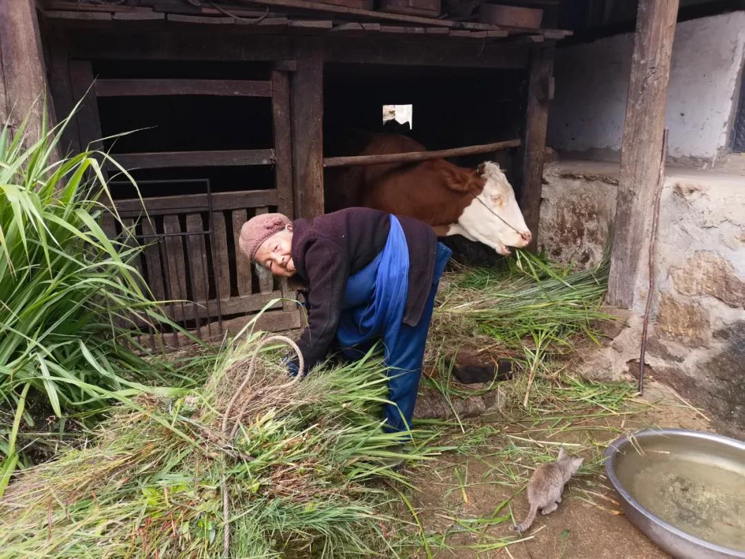 “最好的医生是自己......”工作队员刚正式打开话匣子,透过厨房门,突然看到范绍枝母亲佝偻着身体,冒着细雨去喂牛草,一只小猫在她旁边雀跃着,老人的银发在风雨中微微飘动......那似曾相识的母亲的画面让我心头一震,我连续摁下快门,想让眼前的瞬间变成永恒。这位81的母亲,早年丧夫,儿子、儿媳常年生病、打针吃药,最近儿子又出车祸,摔伤了头,两个孙子到了男大当婚年纪还未成家,大孙子尚欠助学4000元贷款。她特别体谅儿子范绍枝,多年来集五、六种疾病于一身,承担不起医疗费用,大都是自己找草药来维持治疗。平时她不顾自己年迈衰老的身体,掰玉米、剁猪草、喂牛......力所能及做家务,能够帮助儿孙一点算一点,用他的话说“不知道哪一天连这样的机会都没有了。”