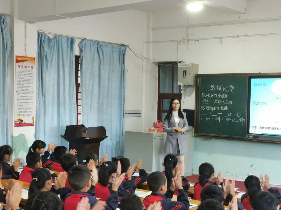 第二节课是镇安镇中心学校濮聪英老师带来的四年级数学广角中的优化问题—“烙饼问题”。濮老师以孩子们熟悉的动画角色光头强为切入点,从光头强的烙饼摊引出新知识:烙饼问题,并利用一些小教具,引导学生自己动手,让学生在实践中明白了优化的重要性和实用性。