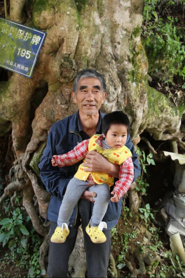 说实话,古茶村落我看得不少了。镇东村,我一眼就喜欢。 茅草地,芹菜塘,仅从字面看,就是可以草飞莺长,树木自由而生的地方。果然,才进茅草地村口,迎面三棵与白云争天空的巨大茶树就耸立在路左侧的坡坎上。一看树干上,是挂了编号的:“千年古茶1194” “千年古茶1195” “千年古茶1196”。1195号的主人杨保民,刚好抱着小孙子在茶树下,我们于是邀请他与茶树合影。他介绍说从他记事起家里就有三棵老茶树,从他能上茶树起,就每年帮父母去打茶,一打就是一辈子。这几年茶价好,一公斤能卖60元,三棵茶树能收120多公斤鲜茶,也是七八千块钱,零花钱是解决了。 再往里走,从一个竹栅栏旁拐弯,一棵树根长菌子的老茶树拦住了去路。这棵编号1189的千年茶树,树干枯死了一半,另一半还涅槃而生,爆发出蓬勃的生命力,枝干遒劲,叶片茂盛,一朵朵带有奇香的洁白茶花藏在枝叶间,黄色的花蕊让我想起永平阿腰寨那1300年的死而后生的唐梅。茶树的主人李押秀和儿子杨富元对这棵死了一半还能枝繁叶茂的茶树非常珍惜,也对每年还能采100多斤鲜茶非常满足。 绕过这棵长菌子的茶树上到一块平地上,一个更壮观的景象出现在眼前,一排十几棵的大茶树,列位仙帮一样器宇轩昂地挺立在阳光下,大地苍穹,都愿意赠送一份风调雨顺。在它们身旁,洋丝瓜,包谷,芭蕉芋,辣椒,皆在蓬勃生长;村里的居民,该收谷子的收谷子,该晒包谷的晒包谷,该挖地的挖地,一切不疾不徐。茶仙们气定神闲地凝视着人间烟火,千年的根系,延展到大地的深处,也延展到村民的经脉里。 据说,由龙陵县人民政府、龙陵县林草局牵头的镇东千年古茶树的调查、摸底、编号工作,从2015年底开始,历时4年,到最后一个编号3017的牌子挂上树,参与的县乡镇村各级干部犹如拜了3017个树神,敬畏之情如一杯荡气回肠的古树茶在胸间奔流。