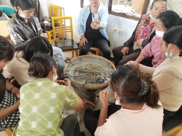 培训过程中,来自龙陵县益民职业培训学校的资深石斛枫斗加工培训师就石斛的种类、形态特征、药用价值、经济效益、无公害栽培等作了详细的讲解,对石斛的分拣、清洗、绕条、定型等步骤进行了深入细致的培训。特别是在绕条环节上,培训老师统一现场示范后,学员们就开始几人一组,围坐在圆圆的操作台周围,拿起烤干的石斛鲜条按照培训老师的示范,有样学样,剪成合适的小段开始绕条,遇到不会的地方,也纷纷举手请教老师怎么做,整个培训现场充满了浓厚的学习氛围。