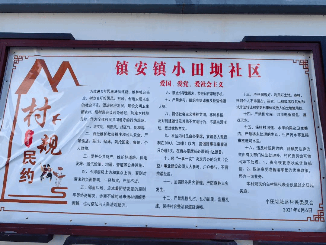 “村规民约”约出守法“新风貌”。小田坝村将“禁止小学生周末、节假日在家玩手机”、“反电信诈骗”等内容写入村规民约,通过签订《小田坝小学关于严禁学生周末节假日在家玩手机的协议书》等措施拓宽家校沟通的渠道,延伸家校合作的途径,优化家校双方的教育力量并使之形成合力,做到家庭学校紧密结合,形成了一股强有力的教育合力,促进学校的发展,促成孩子的健康成长。培养村级“法律明白人”入户宣传“法律法规”,确保90%以上的群众知法懂法。开展“退役老兵讲法”、“返乡大学生领学法”等志愿者服务渲染法律法规宣传氛围,积极引导村民共建和谐乡村,致力“约”出和谐乡村新风貌。
