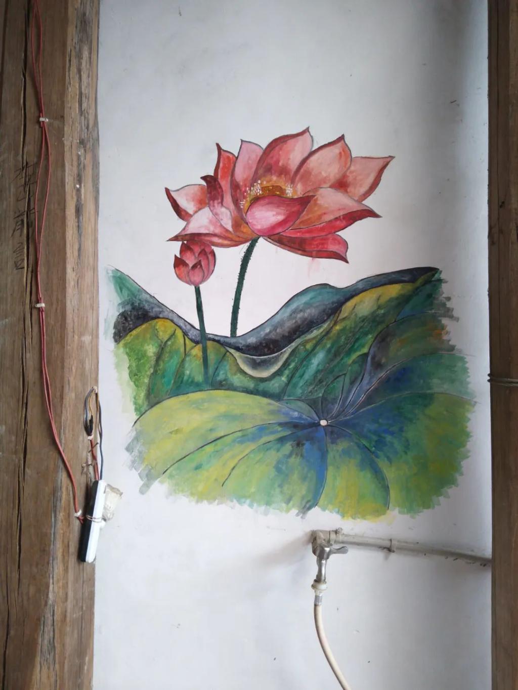 李菊玉除擅长写作外,还特别喜欢画画,她家的走廊和角墙上,都留下了她的作品。