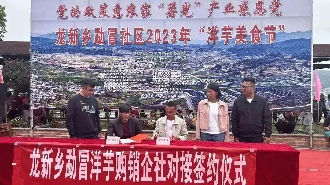 个大质优的勐冒洋芋受到广大消费者和经销商青睐。5月1日,在“勐冒洋芋美食节”举办之际,龙新乡勐冒社区与洋芋收购商协商一致并签订洋芋收购协议,同时与农户签订土地流转协议并现场发放土地流转金,在收购协议和土地整合的加持下,勐冒洋芋逐渐形成“订单式”种植,形成统购统销的“种-销”格局,进一步推进农旅融合,打造乡村振兴示范基地,提高农民种洋芋的积极性、主动性,为老百姓打开销路吃上“定心丸”,让洋芋产业真正成为勐冒的代名词,成为勐冒乡村振兴的新动能。