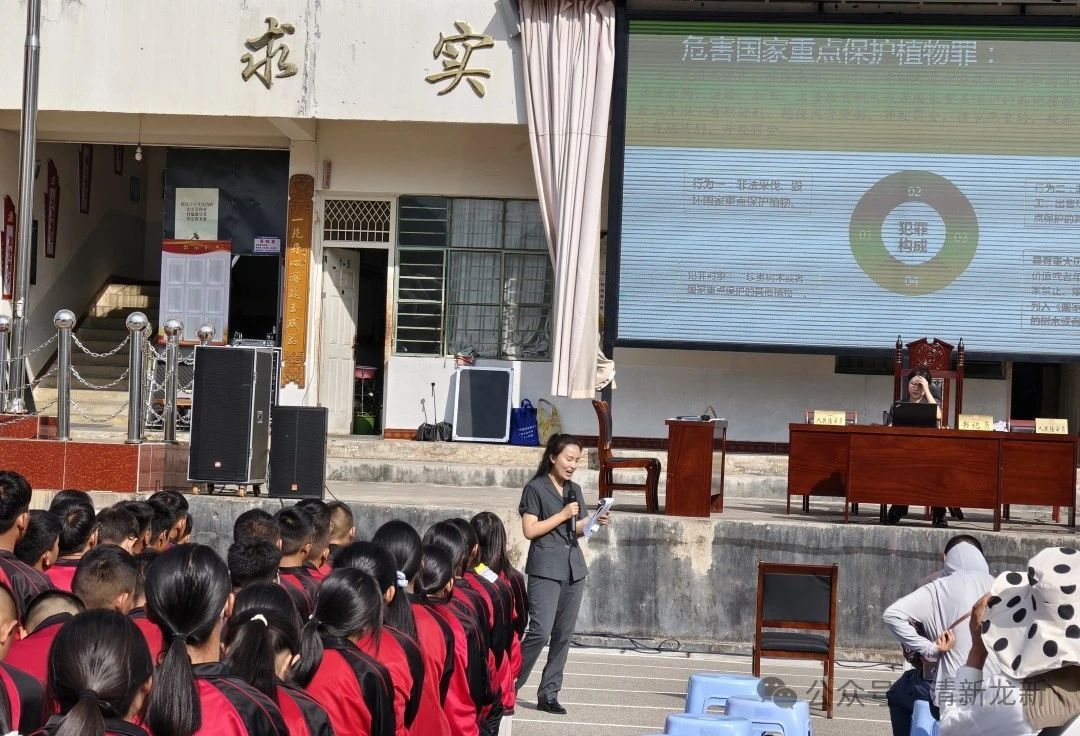 近日,龙陵县人民法院与龙新中学联合开展庭审现场进校园活动,公开审理了一起危害国家重点植物保护案件并当庭宣判,为全校师生上了一堂庄严、生动、直观的法治教育课,让学生“沉浸式”了解法院审判工作、“零距离”感受法律的神圣威严。活动邀请了人大代表、政协委员、人民监督员和500余名学生参与旁听。