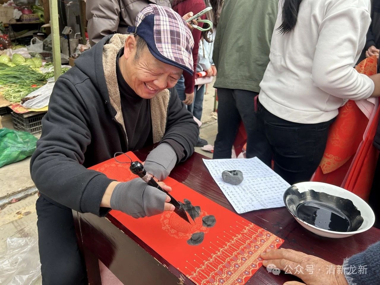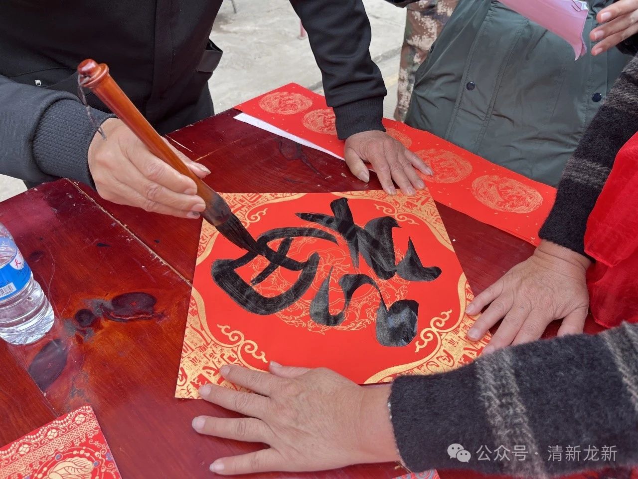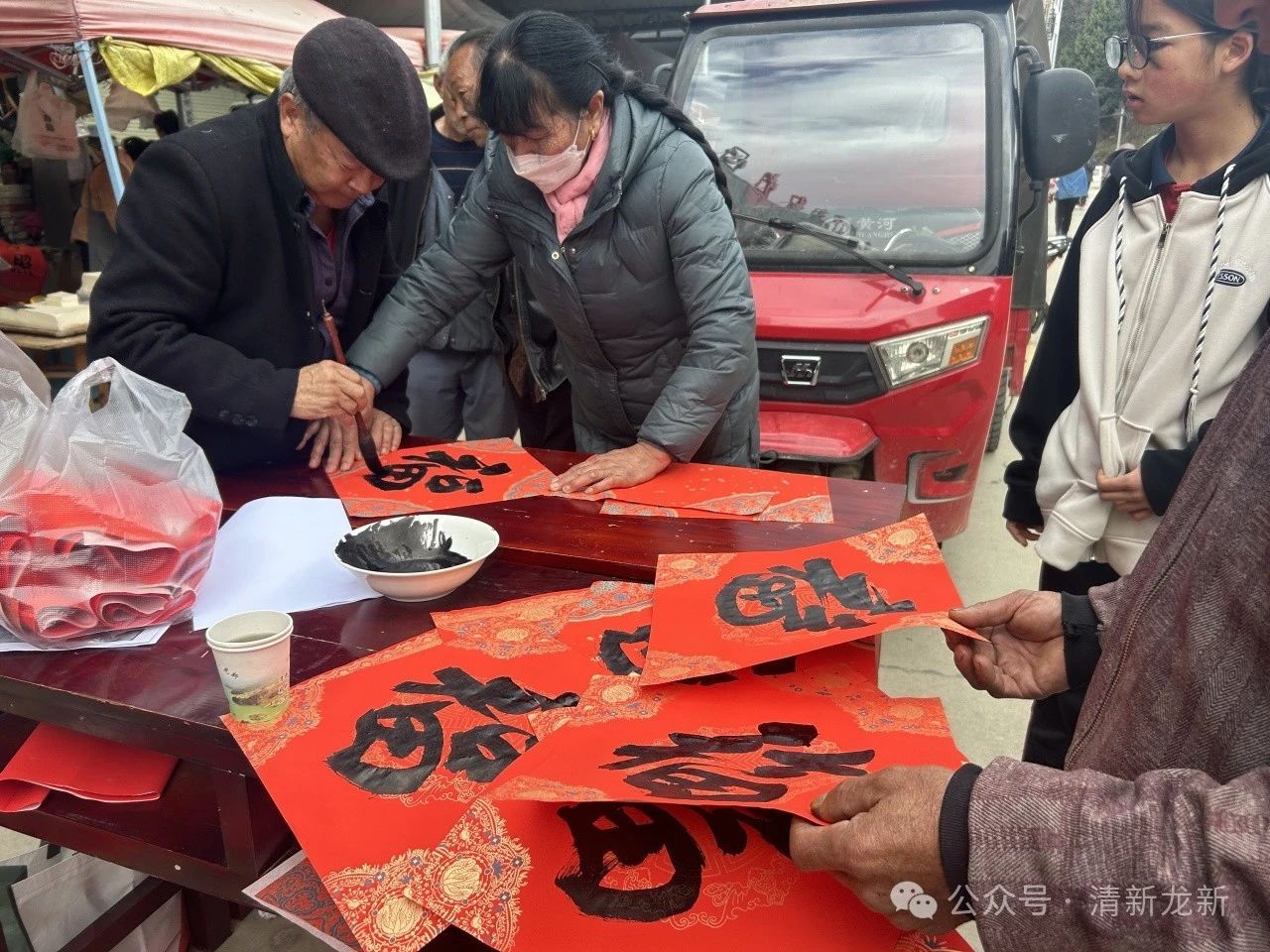 活动现场,老干部们个个妙笔神功,全神贯注地为村民们书写着新春对联,一袭袭红纸上字字行云流水,寄托着对新年的满满祝福与关切。现场人头攒动,村民们也热情高涨,争先邀请老干部为自家书写春联,“人顺家和万事兴”“吉星高照福满堂”等句子,一个个充满吉祥寓意的“福”字,翰墨流芳里,浓浓的年味扑面而来。