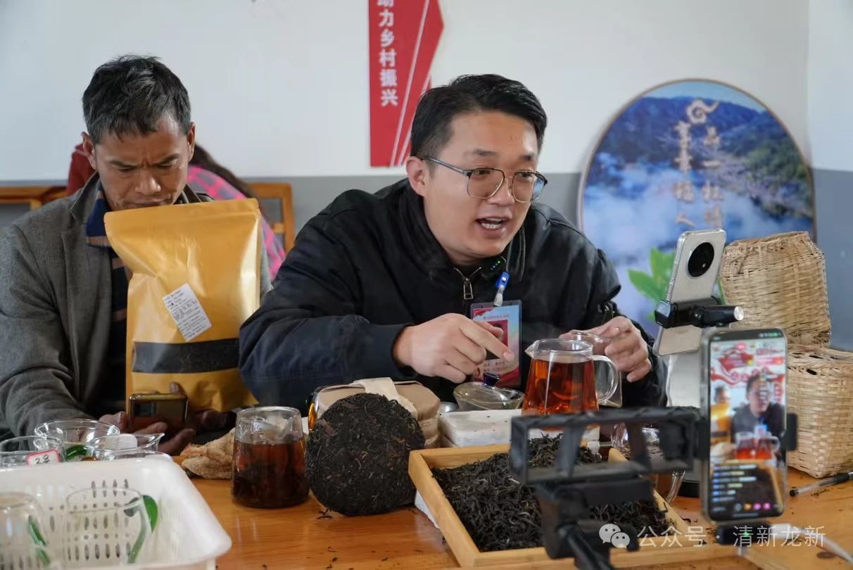 “欢迎各位朋友来到雪山村集体助农茶叶直播间,这里是龙陵县龙新乡雪山村,我们村生态环境好,茶叶资源丰富,茶汤口感醇厚,直播间所售茶叶均为农民自产,如有喜欢的,请大家点开右下角小黄车下单。”早上9点,雪山村茶叶推荐官陈开虎开启了一天的直播。