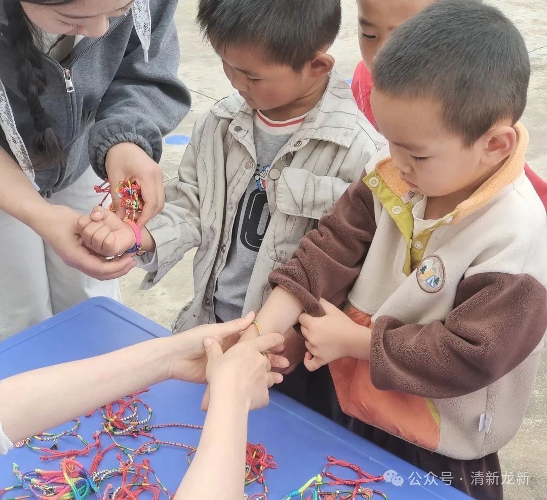 戴彩绳,五彩纳吉好运来。老师们提前准备好五彩斑斓的彩绳,活动中依次为幼儿系在手腕上。红、黄、蓝、绿、紫的彩绳在小手上轻轻缠绕,老师讲解着“彩福纳吉、好运常伴”的寓意,孩子们互相欣赏着对方的彩绳,欢快地挥舞着小手,五彩的绳结在阳光下闪烁,成为节日里一道亮丽的风景线。