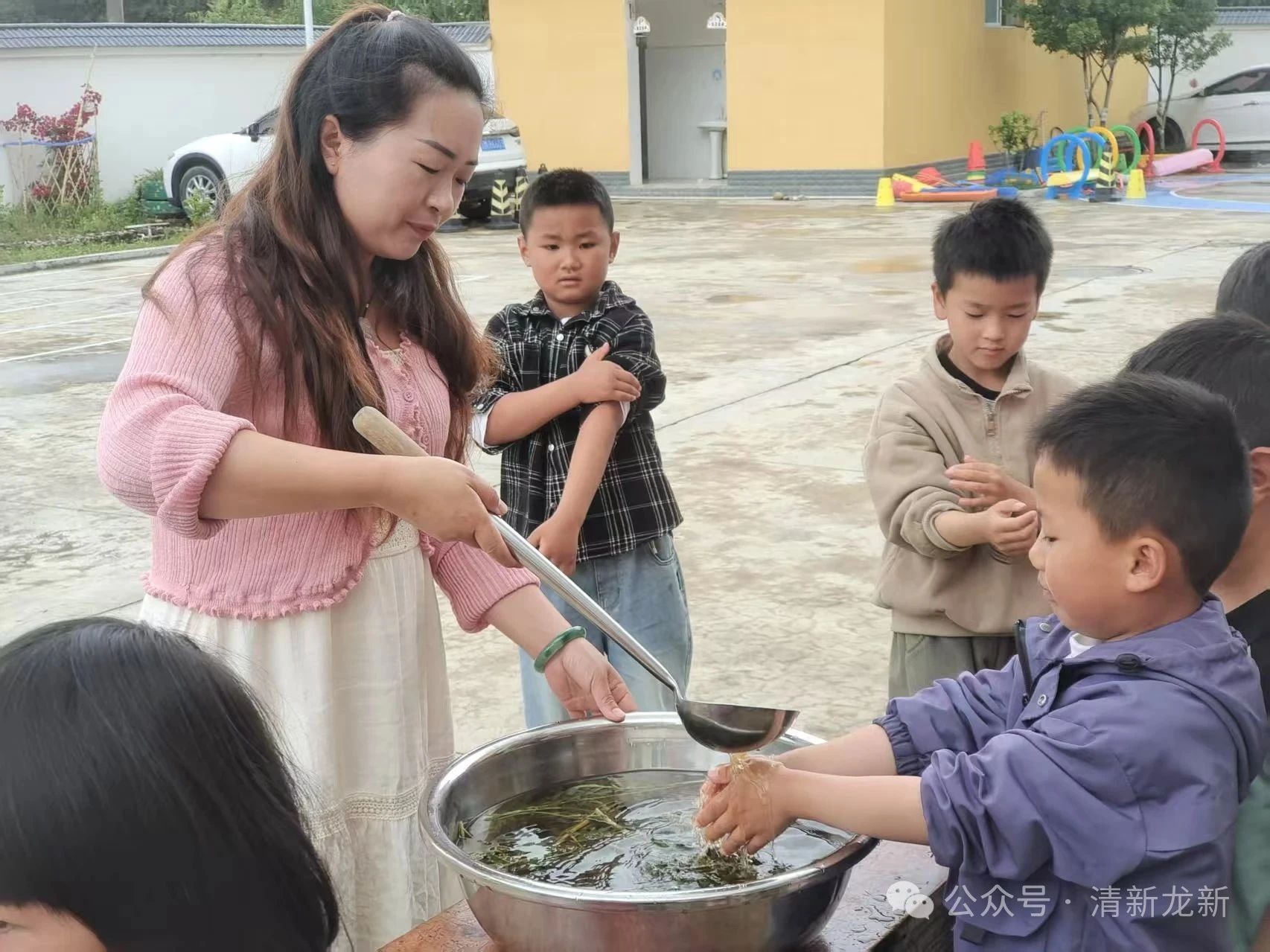 木兰汤洗手,避岁驱邪祈平安。老师们提前用采摘的艾草煮好“木兰汤”,温热的汤汁散发着艾草的清新气息。活动中,老师们用小瓢舀起木兰汤,轻轻为每位幼儿洗手。汤水流过小手时,老师轻声讲解“避岁驱邪、端午安康”的寓意,孩子们认真地伸出小手,感受着传统习俗的温暖仪式感。
