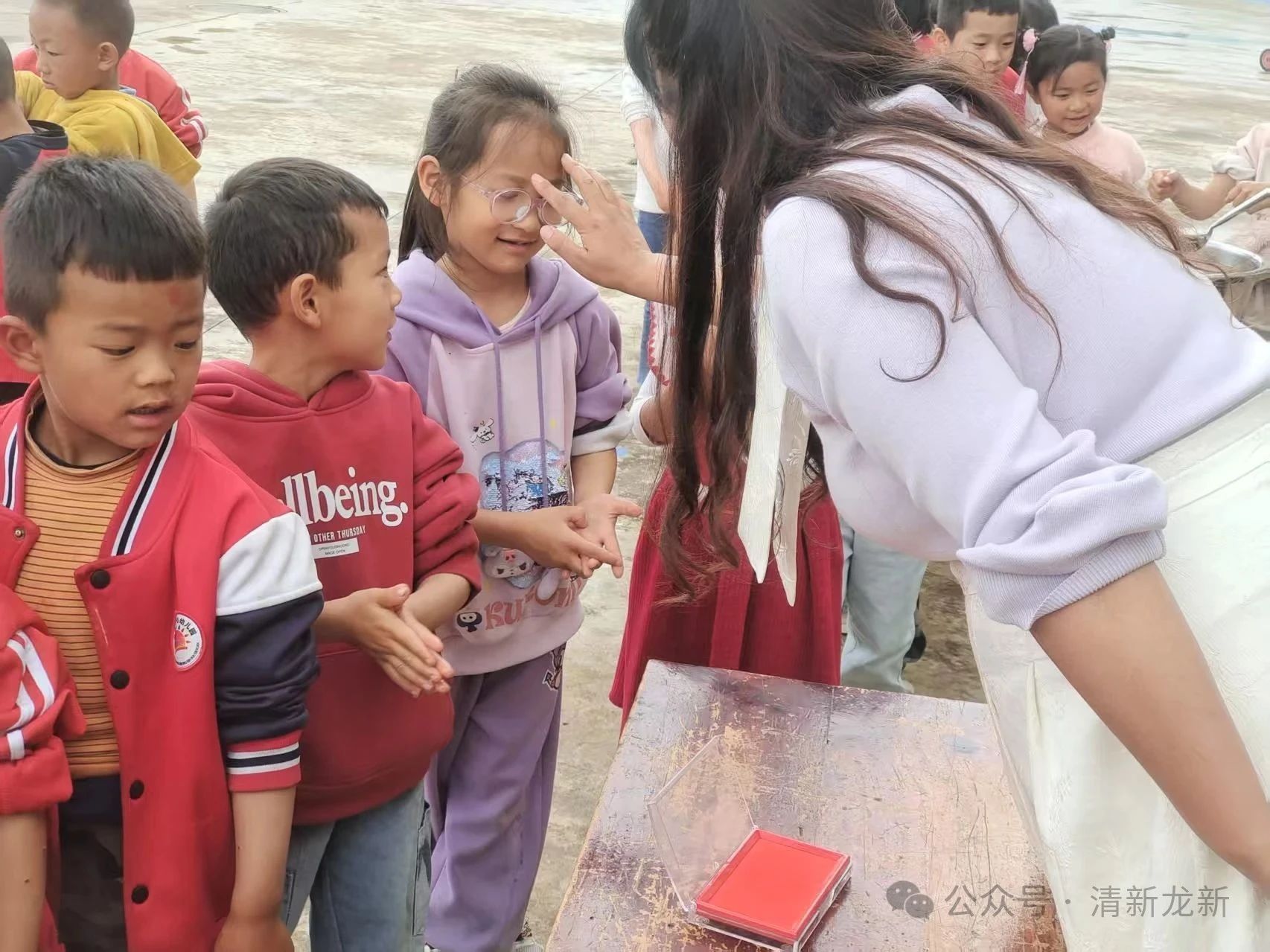 点朱砂,额间红点寄安康。老师用棉签蘸取朱砂,轻轻点在幼儿额头正中央,化作一枚鲜红的“平安痣”。“点朱砂,保平安”,老师们一边点着一边温柔地祝福,孩子们对着镜子好奇地触摸额间的红点,脸上洋溢着天真的笑容,这颗红点不仅是健康平安的象征,更让他们感受到传统文化的独特魅力。