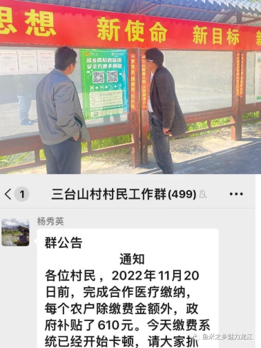 多措并举,收缴到位。“些小吾曹州县吏,一枝一叶总关情”。为确保城乡居民基本医疗缴费不漏一人,根据未缴费人员花名册进行分类,对于外辖区居住、外出务工人员,村级干部、驻村工作队员这些“些小吾曹州县吏”,通过电话或微信主动联系,督促他们及时缴费。对于思想不通的群众,村“两委”工作人员、驻村工作队主动上门了解情况,耐心细致的讲解政策;对于年老体弱、行动不便、不会用智能手机的村民,村组干部、驻村工作队本着“惠民为民、贴心服务、服务上门”这一情怀,个人自筹手机备用金入户帮助农户代缴,确保辖区老年人群“老有所依、病有所医”,全部享受到国家惠民政策。