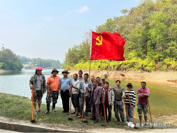 中午时分,杨梅坡水库党旗迎风飘扬,社区工作人员、党员手持锄头、扫把、铁铲、刀、编织袋,发扬不怕脏、不怕累的精神,不遗余力,相互配合,仔细对引水沟里的枯枝落叶、淤泥、杂草、白色垃圾等进行捡、砍、铲、挖处理,并呼吁附近群众对在河湖内乱扔垃圾、游泳等不文明行为进行抵制,呼吁大家共同维护良好的河湖生态环境。