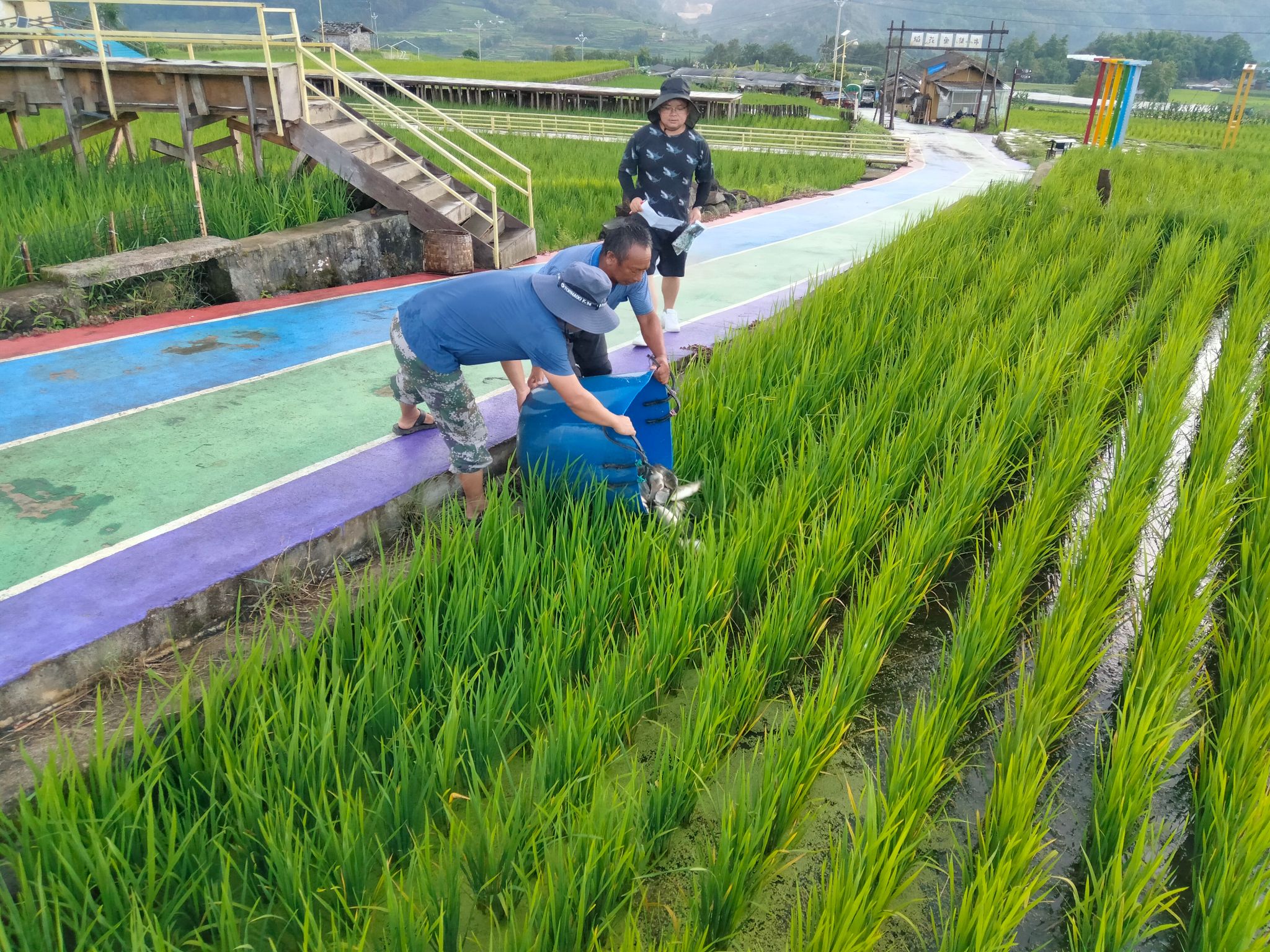 龙江乡农业综合保障和技术服务中心工作人员杨德荣介绍:“我们沉下村对农户进行技术指导,对于新开挖的养鱼稻田,进排水口一般设在稻田的两对角,以保证水流畅通。开挖的鱼沟、鱼溜(沟溜占比不超过稻田面积的5%-8%,饵料按“四定”(定时、定质、定量、定位)投喂农家料,日投饵量为鱼体重量的2%~3%。”今年,龙江乡“稻+鱼”生态种养再扩容,打造了核心样板区、单产提升区等试验区,覆盖勐柳、新寨、赧等、硝塘、邦明、大新寨、弄福7个村,惠及群众396户,投放鱼苗24吨。
