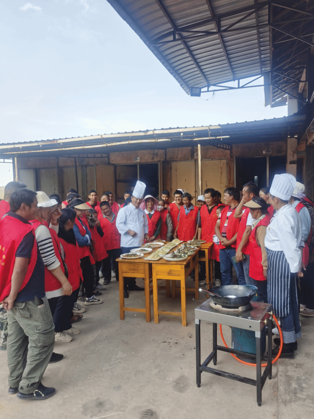 学习“新技能”。培训中,培训老师先将学员进行分组,然后就每天所学的菜谱从食材的选择、调料的合理搭配等做详细介绍,并现场进行厨艺教学,边操作边讲解;学员们边看边记,还不时地提一些烹饪中遇到的问题。培训老师讲解完学员们进行实操,做好后摆盘进行评比,并通过试吃本小组与其他小组的菜肴,评价彼此的优缺点,改进不足,以此提高烹饪水平。