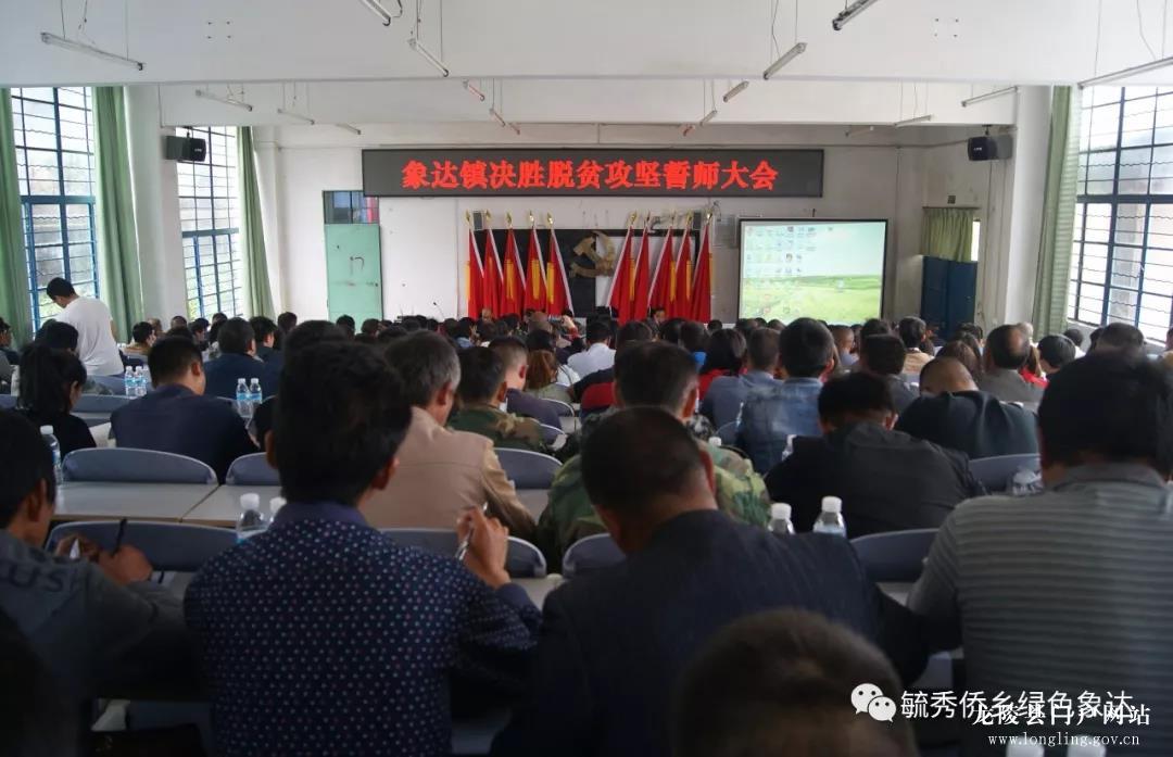 为深入学习领会习近平总书记扶贫开发战略思想,认真贯彻落实中央和省市县对脱贫攻坚工作的系列决策部署以及5月5日召开的全县脱贫攻坚誓师大会精神,动员全镇迅速吹响决战誓师的号角,正式进入作战模式。象达镇于5月8日召开全镇决胜脱贫攻坚誓师大会。镇村两级全体扶贫干部、驻镇单位负责人、县级挂镇领导等共计260余人参加会议。