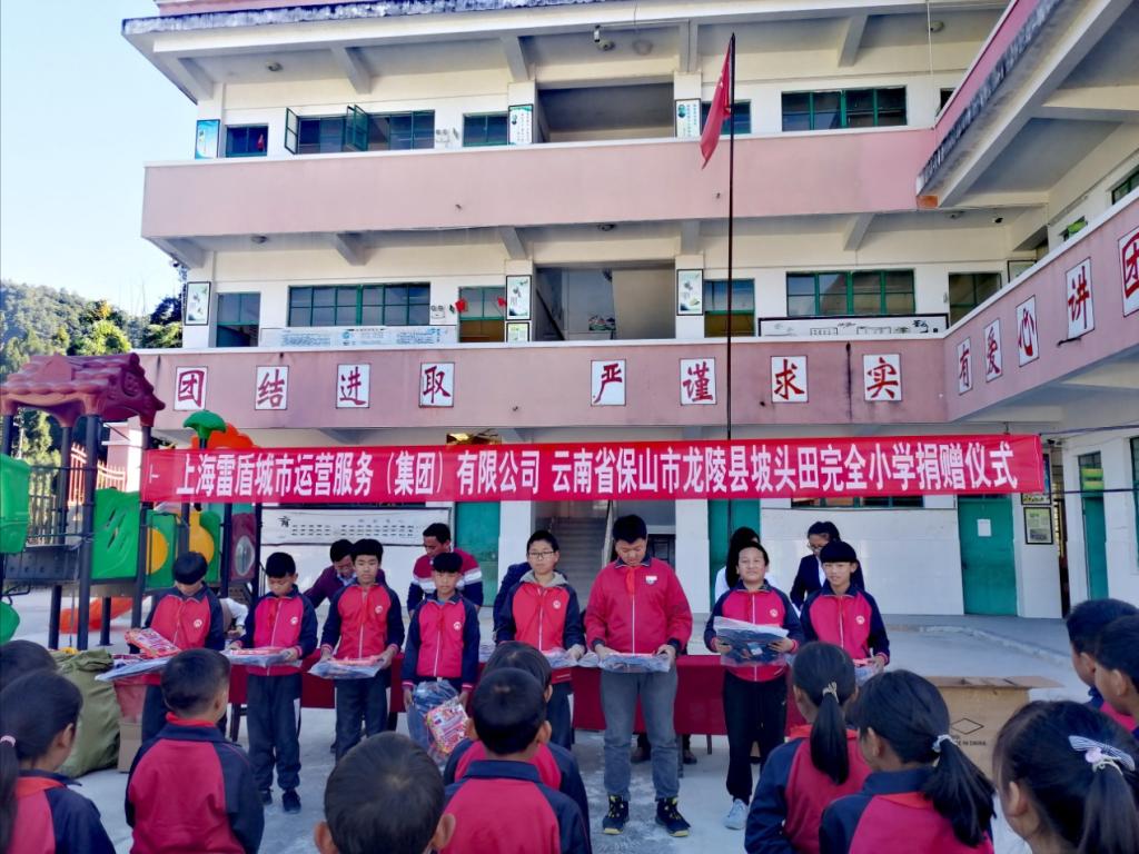 捐赠仪式上,象达镇中心校校长对上海雷盾城市运营服务(集团)有限公司及相关人员表示感谢。对学生寄语厚望,教育学生要有感恩之心,努力学习长大后奉献社会。