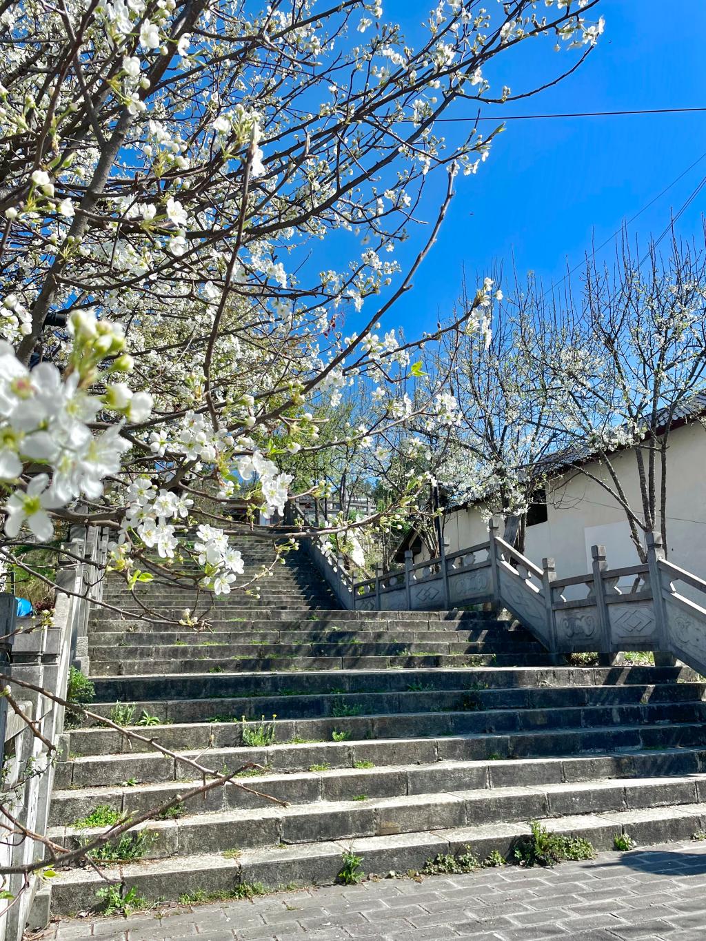 晚上听着春雷一响,大雨倾盆落下,梨花便要遭了殃了。第二天雨过天晴,石阶上满是被雨水打落的花瓣,白茫茫一层铺在石板上,有一种别样的凋零的美,细细观察发现花瓣与挂在枝头时并无二致,勐蚌村的梨花像极了这里的村民,有一股韧劲,任你风吹雨打还是原来的模样。