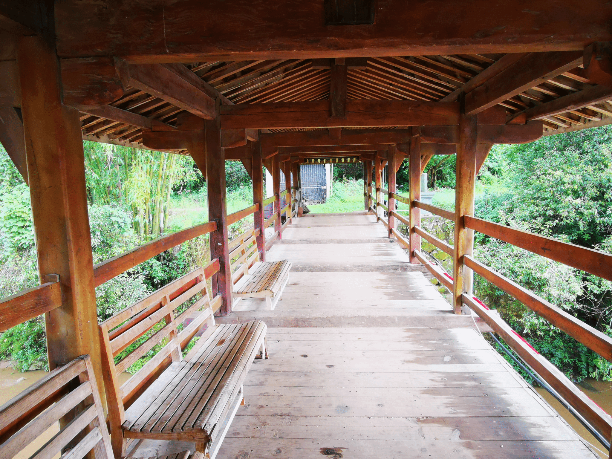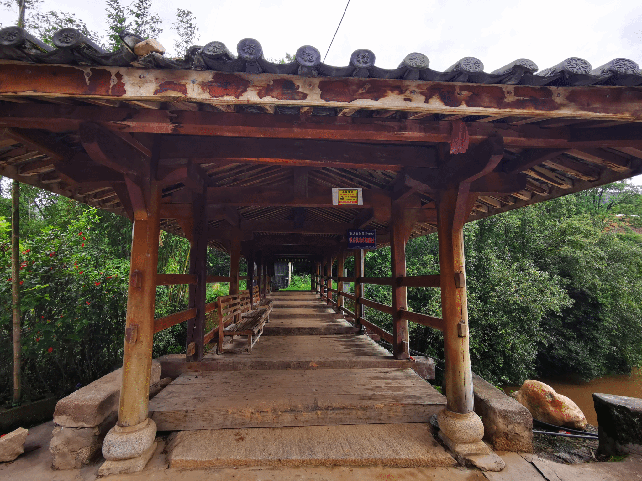 这里的风雨桥也称朝阳桥,始建于清末,1964年由朝阳村重建,为历代象达经朝阳至苏帕河下游帮工、大厂等地的过河通道,因为行人过往能躲避风雨,故名风雨桥。桥由五根巨木搭接两岸,上覆四檐出水风雨桥亭,桥面铺板,两旁设置栏、长凳,形成长廊式走道。全桥不用一钉一铁,是传统技艺卯榫嵌合,是龙陵境内规模最大,保存最好的木结构风雨桥。