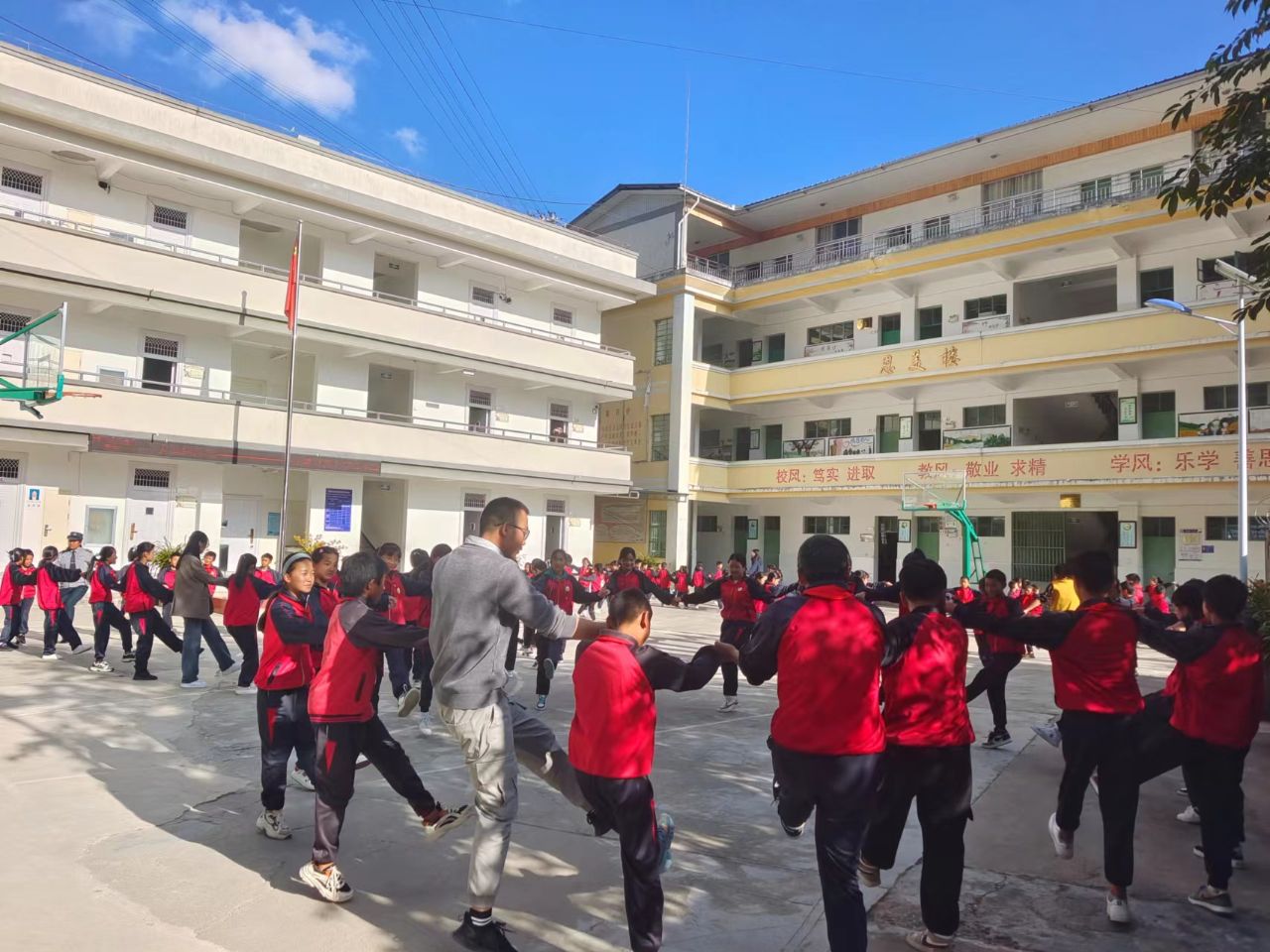 为增强学生体质,加强民族特色教育,学校坚持“国家理念+本土文化”的培养理念,利用大课间活动时间,开展了民族“打跳”活动。
